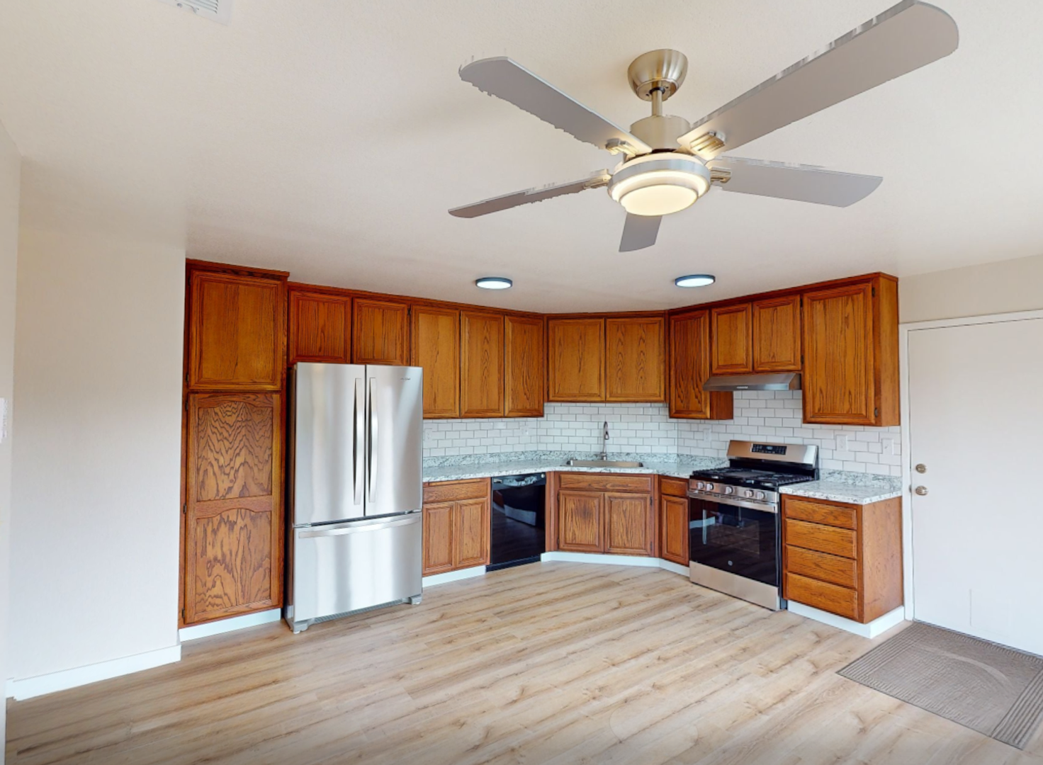 Inside, you’ll find new softwood flooring throughout and a bright, spacious layout. The large dine-in kitchen is perfect for everyday living and entertaining, featuring a professional-grade gas range, full-size dishwasher, refrigerator, and ample cabinet space. A full-size washer and dryer are included for added convenience.